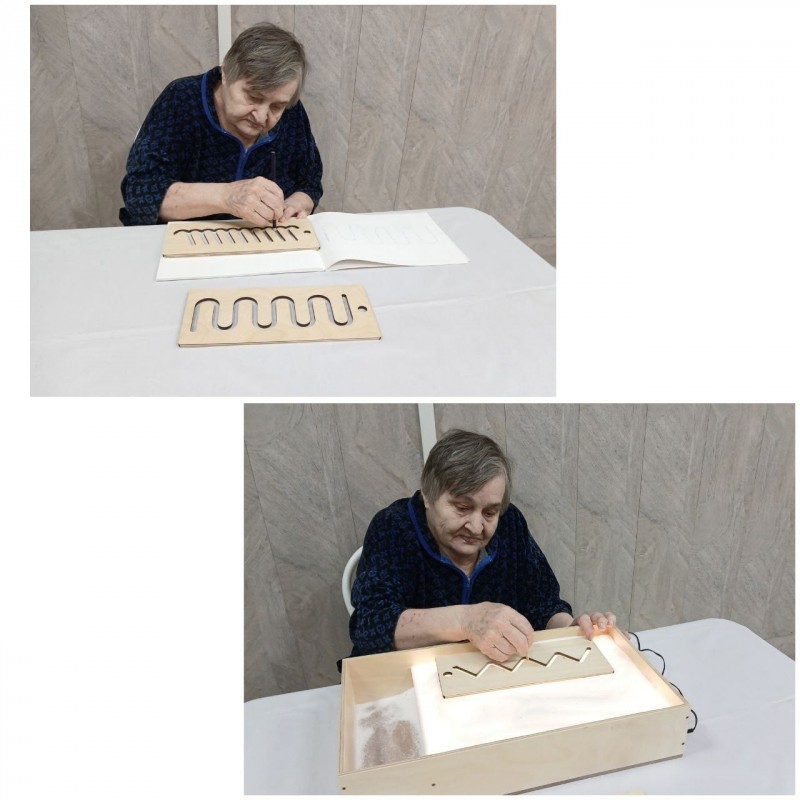 ️В стационарном отделении прошло занятие, направленное на реабилитацию и абилитацию пожилых людей , частично утративших навыки кистевого движения. Обводили рамку трафарета внутри карандашом на бумаге и на песке используя палочку стилус — это упражнение для развития мелкой моторики, которое тренирует точность движений, помогает укрепить пальцы и улучшить контроль над рукой.