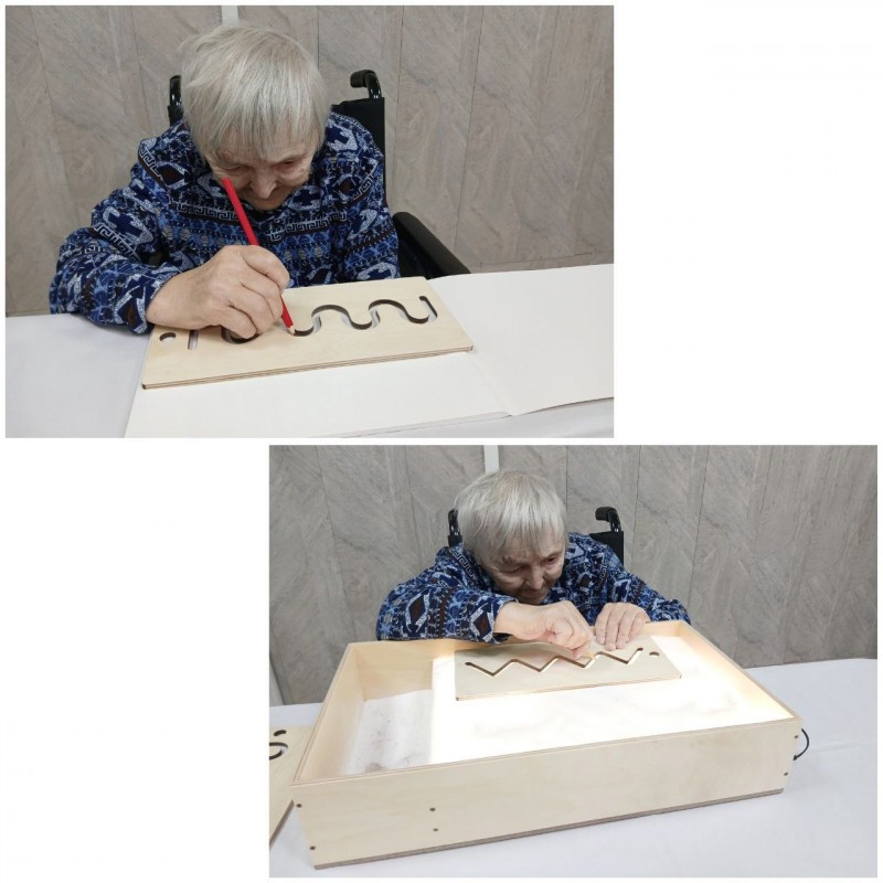 ️В стационарном отделении прошло занятие, направленное на реабилитацию и абилитацию пожилых людей , частично утративших навыки кистевого движения. Обводили рамку трафарета внутри карандашом на бумаге и на песке используя палочку стилус — это упражнение для развития мелкой моторики, которое тренирует точность движений, помогает укрепить пальцы и улучшить контроль над рукой.