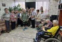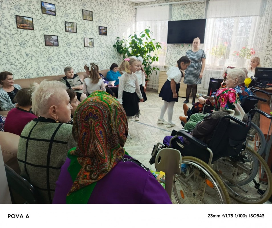 Ребята из детского садика "Солнышко", "Теремок"и ученики школы 1 имени Н.И.Кузнецова пришли, чтобы лично поздравить проживающих стационарного отделения с праздником